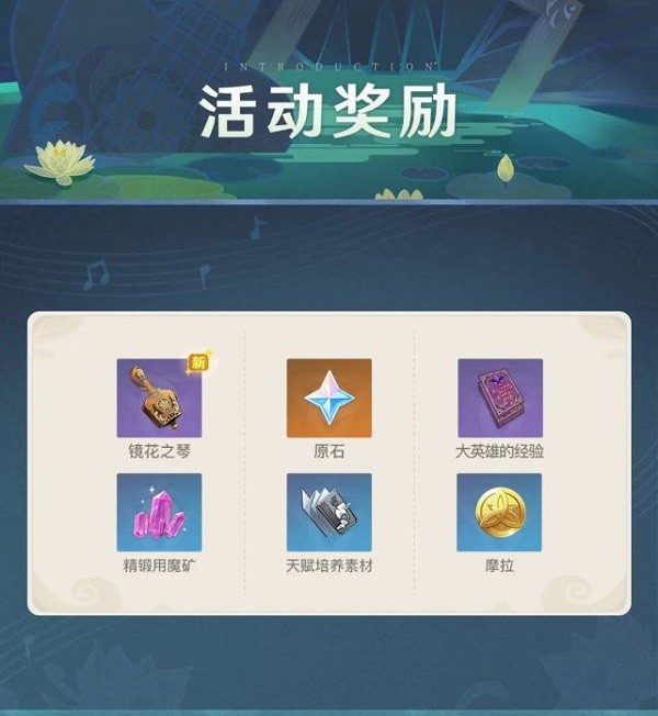 镜花之琴、原石、大英雄的经验、精锻用魔矿、天赋培养素材、摩拉