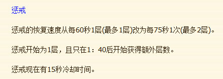 惩戒最大层数:2层,开场1:40内为1层。该时间段内使用惩戒(敌方召唤物,小兵)将不触发充能。1:40开始第一次充能,如果不使用惩戒,2:55 将拥有双层惩戒(使用间隔15秒)。