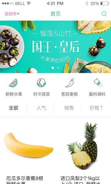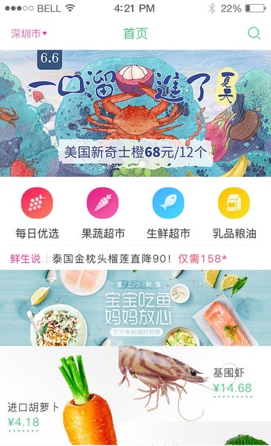 2、包含每日优选、果蔬超市、生鲜水产、乳品粮油及商品分种类显示等功能。