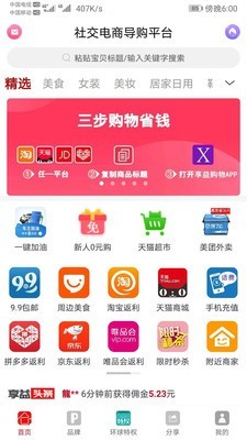 2、包括每日推荐、精选优品、一元秒杀、白菜价、好单库、9.9包邮、直播间、商城返利等各个模块。
