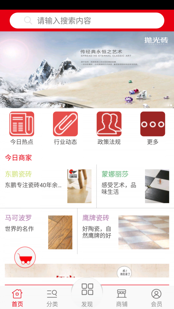 粤东瓷砖网是一个专业的购物网络平台,随时为你提供最新资讯,产品展示,招商代理等信息,该客户端现面向全国招商,各大企业可以在该客户端上发布供求信息,发布广告,发布行情,让各大企业及广大客户更为便捷,该客户端向广大客户展示了一个大型的移动互联网门户平台,以便捷的浏览方式,强大的应用功能,最新的应用资讯信息,为广大客户提供了一个丰富的信息平台。