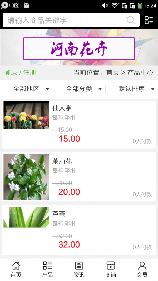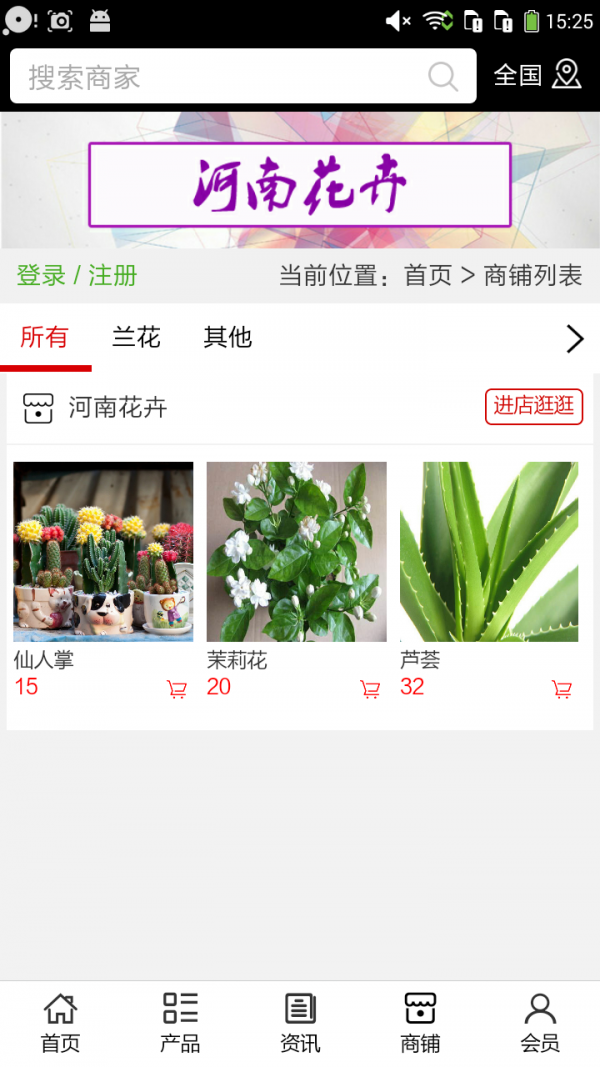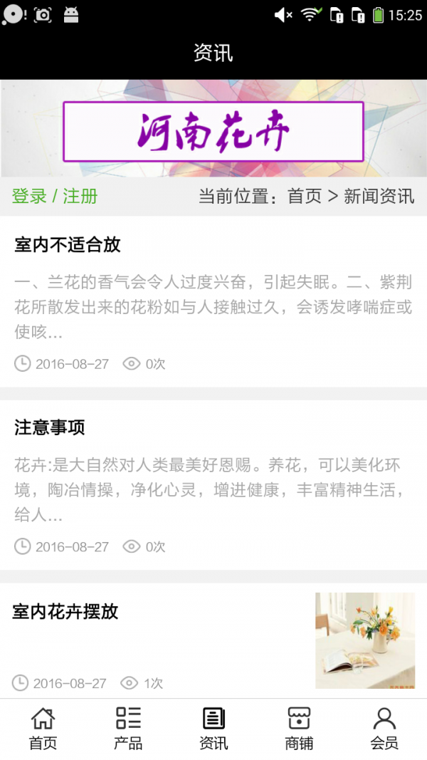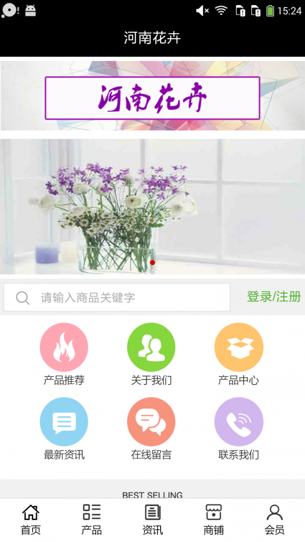 河南花卉客户端不仅具备购物、查询订单、搜索商品、行业资讯和产品评价等常用功能,而且还实现了手机版特有的会员注册登录、广告位、招商开店等功能。