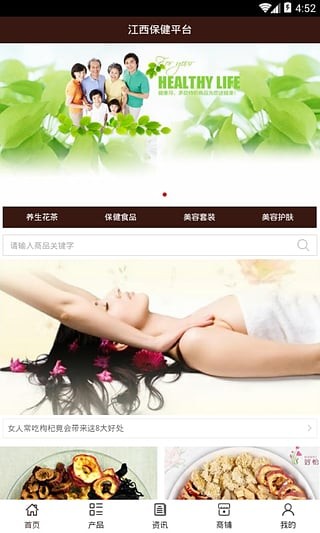 江西保健平台不仅具备购物、查询订单、搜索商品、行业资讯和产品评价等常用功能,而且还实现了手机版特有的会员注册登录、广告位、招商开店等功能。目标是整合当地品牌商、生产商、经销商,为商家和消费者之间提供一站式解决案。
