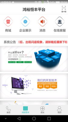 鸿裕恒丰商城应用主要提供包装食品、日用百货、五金交电、通讯器材、家电家具、办公用品、体育用品、建筑材料、花卉、苗木的批发兼零售,房屋购销信息咨询,其中还包括企业展示、通话、聊天、个人中心等。