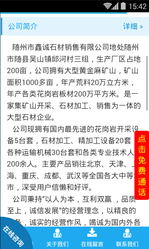 公司现拥有国内最先进的花岗岩开采设备5台套,石材加工、精加工设备20套,各种运输机械30台套和各类专业技术人员200余人。主要产品销往北京、天津、上海、重庆、成都、武汉等全国各大中等城市,深受用户信懒和好评。 公司秉持“以人为本,互利双赢 ,品质至上,诚信发展”的经营理念,以精良的设备,诚实的经营作风,竭诚为国内外各项重大工程及同行提供精良的产品和优质的服务,热诚欢迎各界 朋友前来订购洽谈。