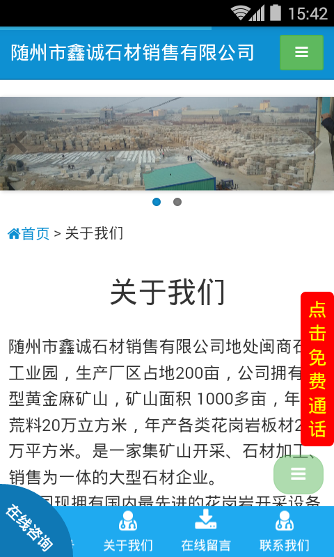 生产厂区占地200亩,公司拥有大型黄金麻矿山,矿山面积1000多亩,年产荒料20万立方米,年产各类花岗岩板材200万平方米。是一家集矿山开采、石材加工、销售为一体的大型石材企业。