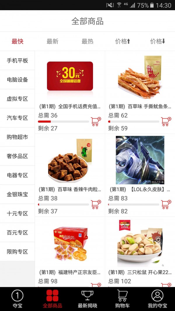 1、每件商品参考市场价平分成相应“等份”,每份1元,1份对应1个夺宝码。