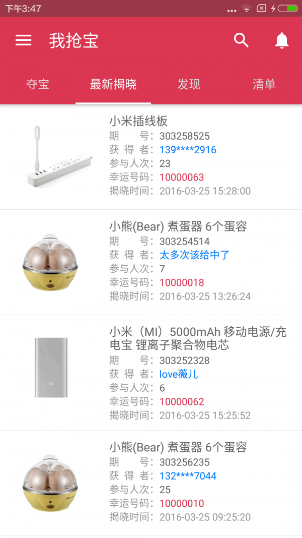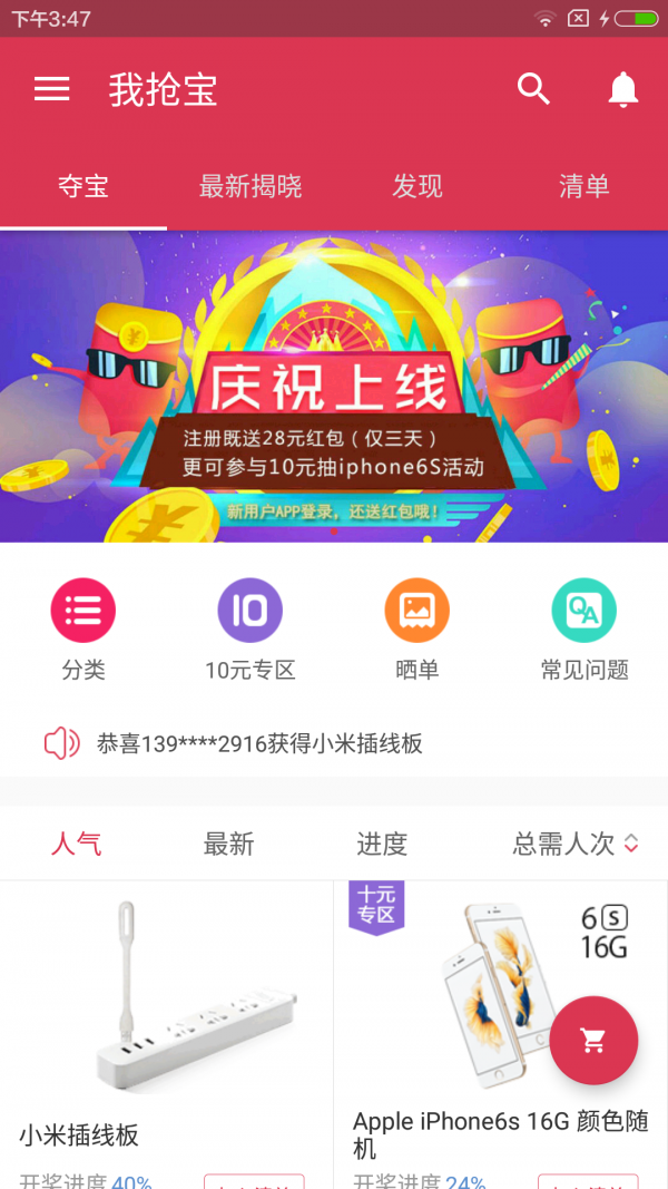 我抢宝--新颖的众筹方式。一元得iphone 一元可以买到各种东西。成就你的梦想。 公平,公正,公开。算法公开。根据随机的组合。 快来一起hi夺宝吧