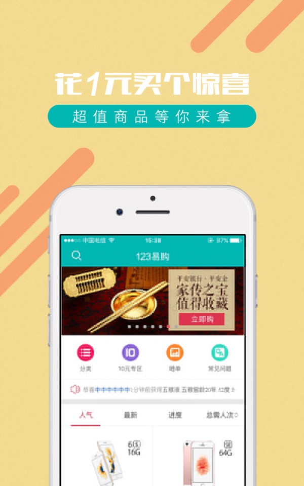 123易购app是一款电商购物应用,123易购app为yoghurt提供当下最时尚的夺宝购物方法,用户可以通过软件轻松购买想要的商品,一元夺宝,惊喜实惠。