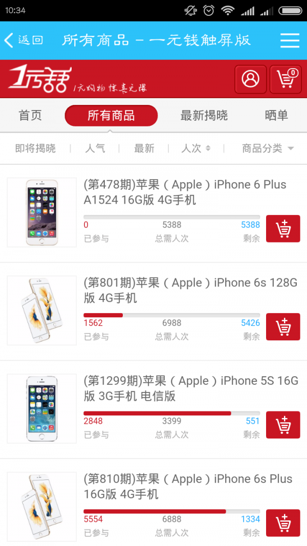 1元钱app是一款1元购物软件,只需一元钱就有可能买到一件商品。1元钱app是把一件商品平分成若干等份出售,每份1个云购币,当一件商品所有等份售出后抽出一名幸运者,该幸运者即可获得此商品,快来下载参与吧,也许你就是那个幸运者!