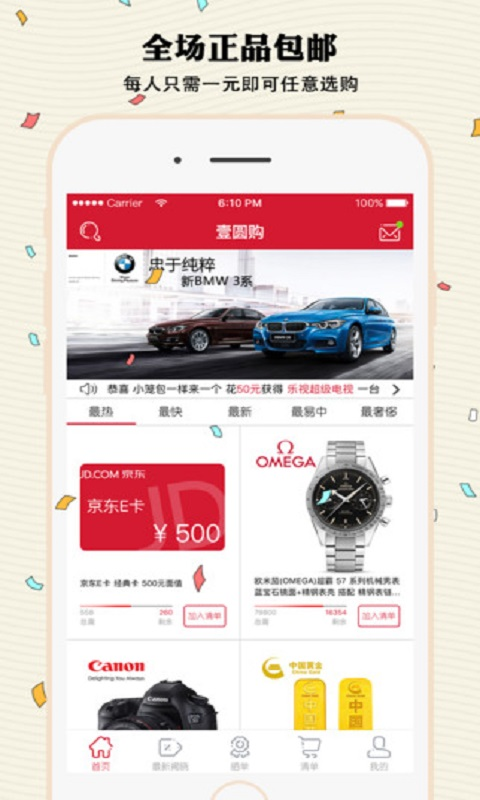 一个让你实现梦想的平台。小小零钱,大大作用。在壹圆购,随手一元钱,也许就能得到你梦寐以求的汽车、手机、单反、黄金…… 一元钱让你妙变高富帅,白富美。你想要的这里都有! 一个让你轻松挣钱的平台。全民都可以参与分成。