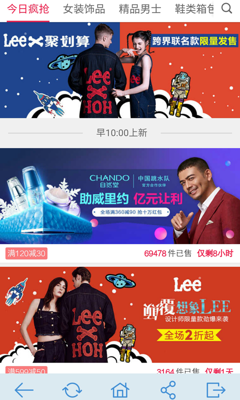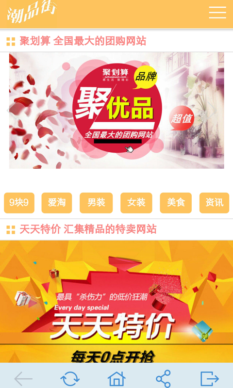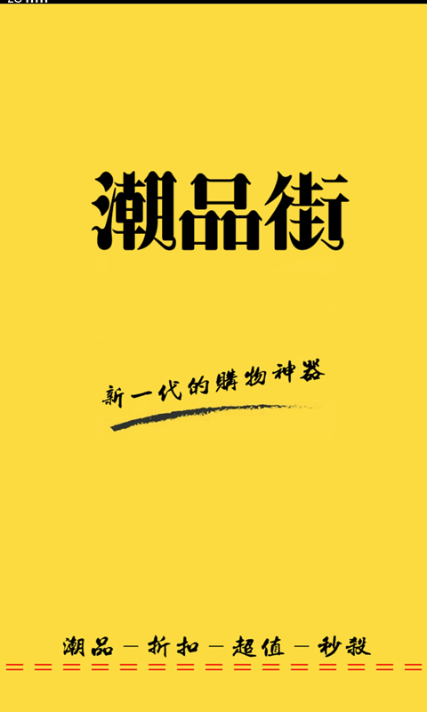 【潮品街】移动端电子商务平台。业务类型有9块9包邮、品牌限时抢购等,主营类目涵盖男女服装、化妆品、母婴、零食等等。