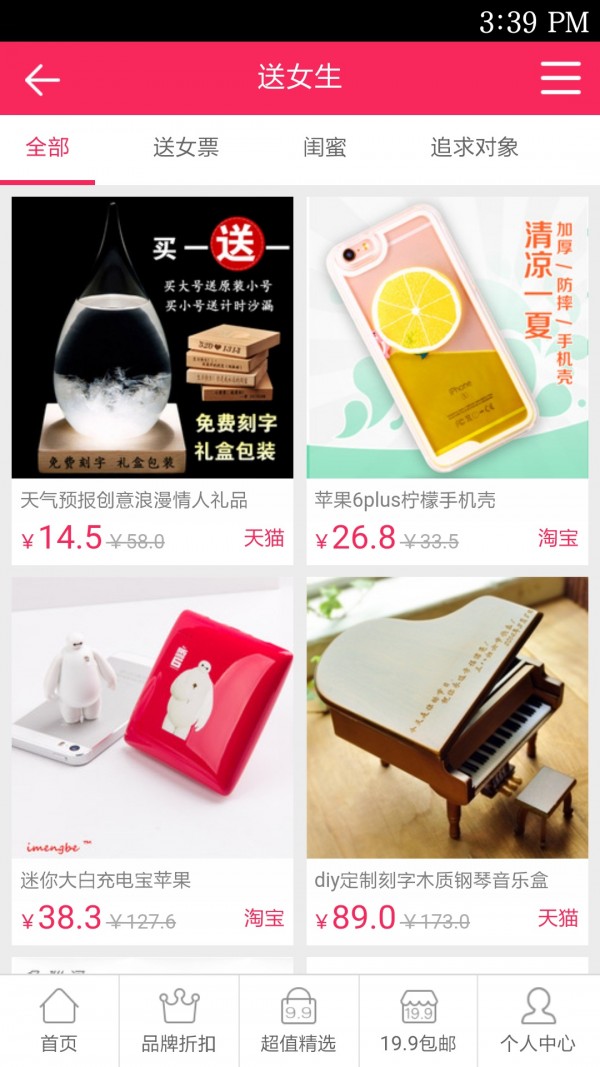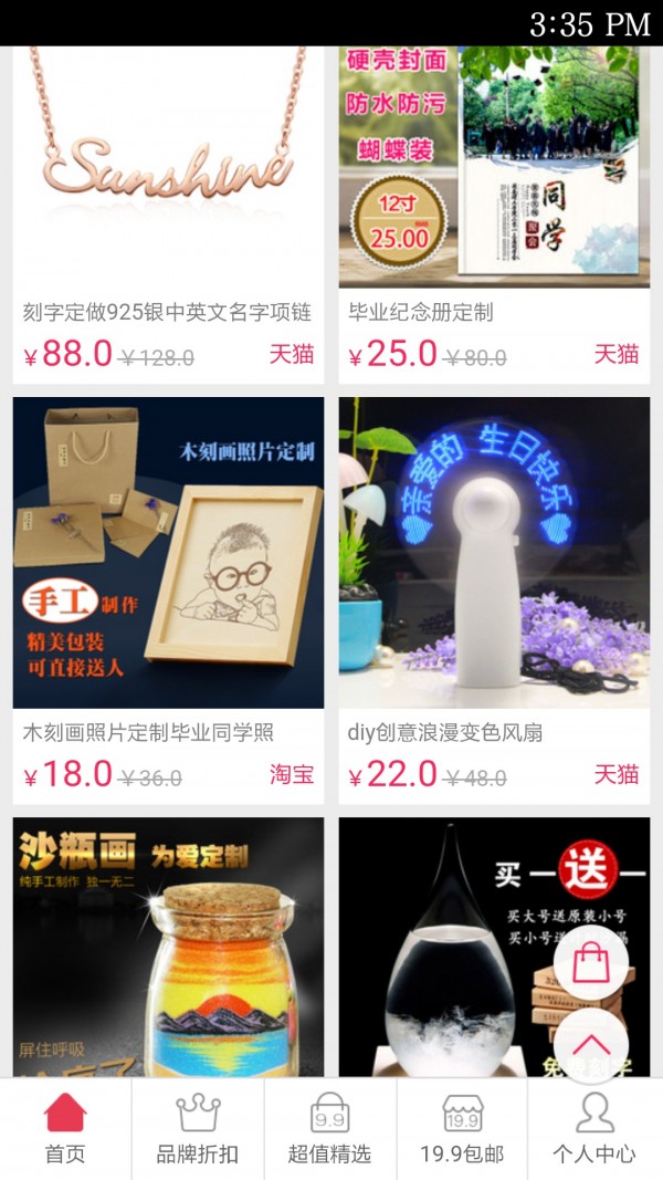 这礼定制app是一款电商购物应用,这礼定制app为用户提供一个折扣品购物平台,精选天猫淘宝等商场的特价商品,让用户可以享受最划算的购物体验。