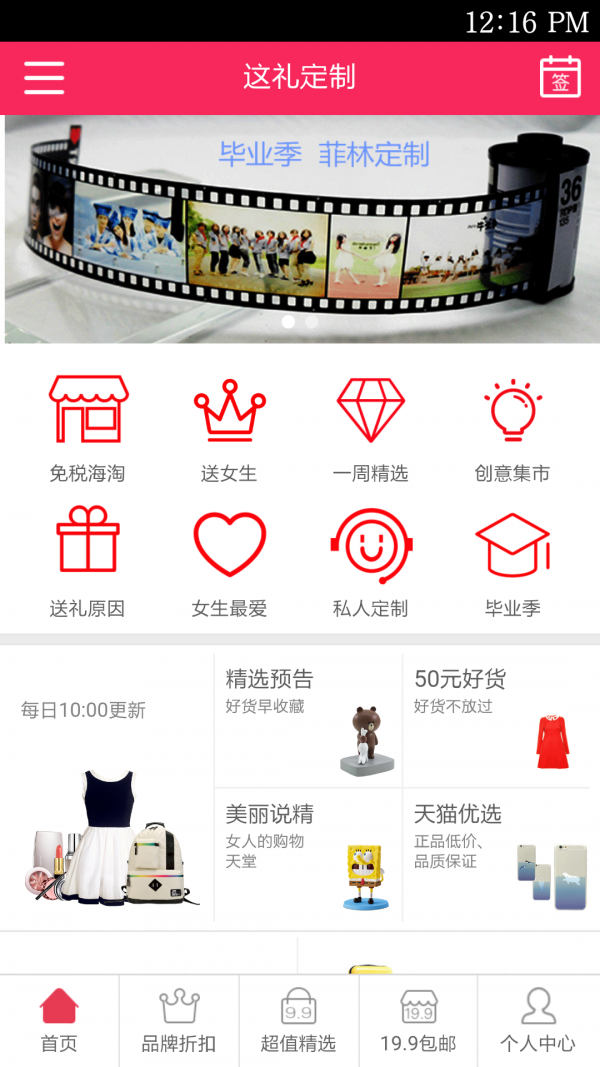 这礼定制,是一款帮助您在淘宝上天猫上找到优质商品的限时折扣app,集合各种精选创意礼物、进口零食、个性化定制,更有专门为年轻女性倾力打造的女生最爱栏目,每天精选推荐当下潮流时尚衣裙限时折扣特卖,无需注册即可体验,买礼物,来这礼定制!买性价比,来这礼定制!买潮流,来这礼定制!