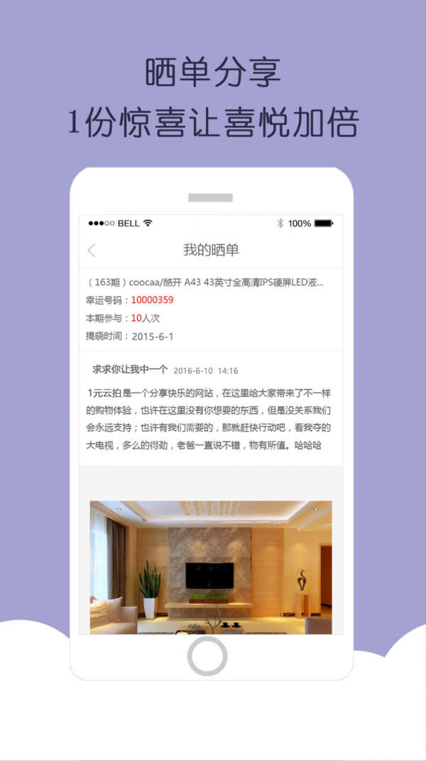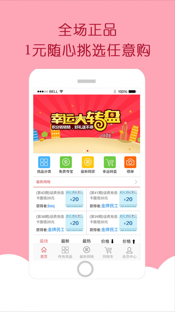 1元云拍app是咸阳云拍电子商务有限公司旗下的专业B2C购物平台,通过1元云拍app用户只需1元就有可能买到一件商品,考验你运气的时刻到了,快来下载试试吧!