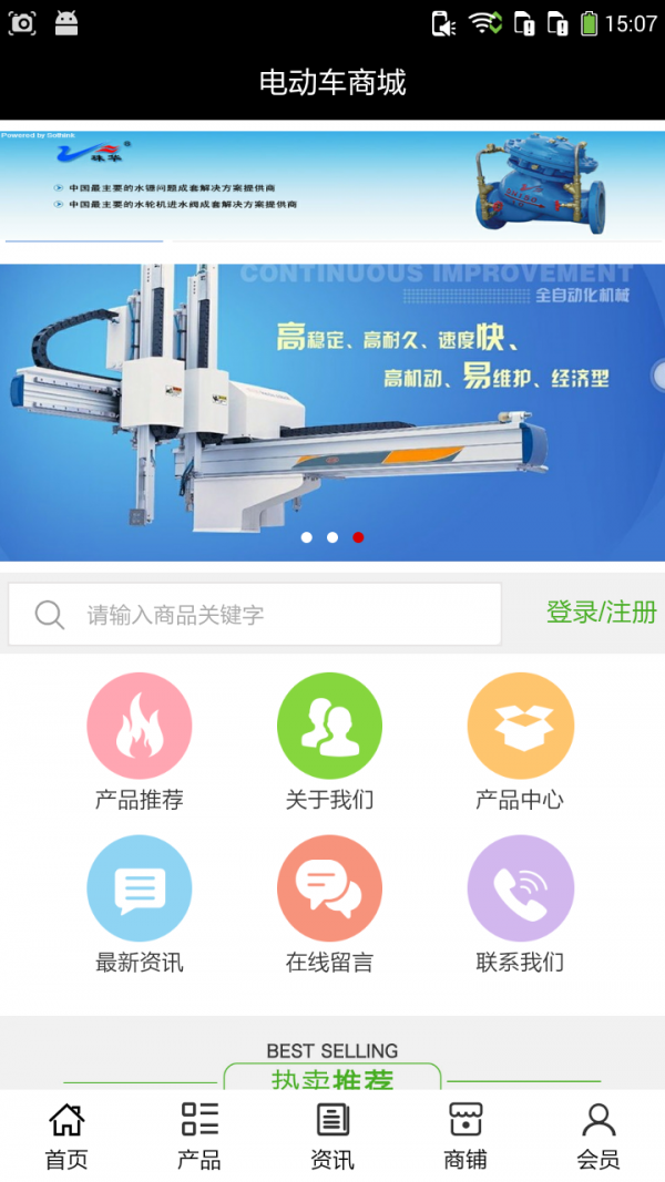 电动车商城app不仅具备购物、查询订单、搜索商品、行业资讯和产品评价等常用功能,而且还实现了手机版特有的会员注册登录、广告位、招商开店等功能,其目标是整合当地品牌商、生产商、经销商,为商家和消费者之间提供一站式解决案。