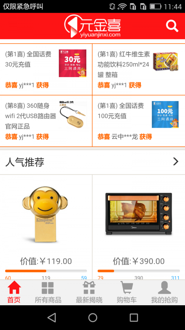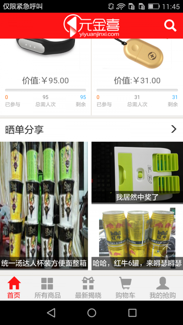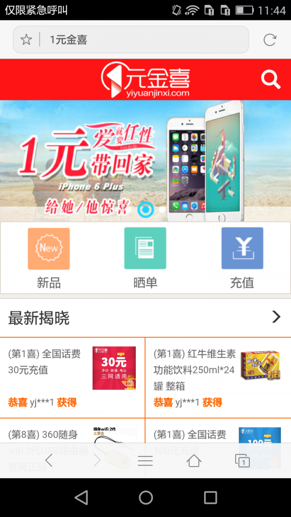 1元金喜app是一款1元抢购软件,只需要一元,你就有机会抢到iPhone 6s、宝马、奔驰!一元金喜app众筹,任何人最低只需1元就有机会获得一件奖品,玩法创新,购物体验超赞,奖品均为炙手可热的爆款。