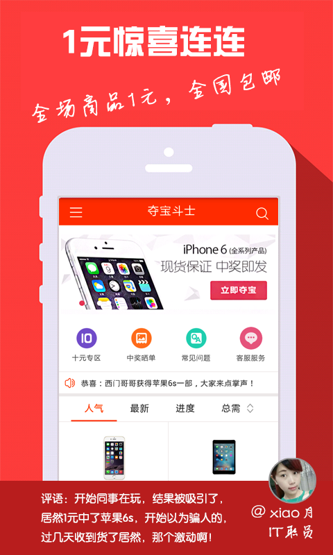 夺宝斗士app是一款网络购物应用,是杭州网俊网络科技有限公司推出的1元购平台。夺宝斗士app,这是个让你花费1快钱就有几率获取价值上千产品的众筹平台。夺宝斗士,1元抢购苹果6S,更多微信充值送红包活动正在进行中。