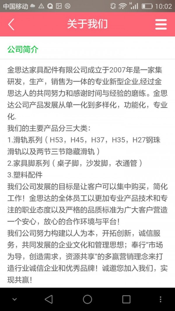 金思达家具配件有限公司成立于2007年是一家集研发,生产,销售为一体的专业新型企业,经过金思达人的共同努力和感谢时间与经验的磨练。金思达公司产品发展从单一化到多样化,功能化,专业化。