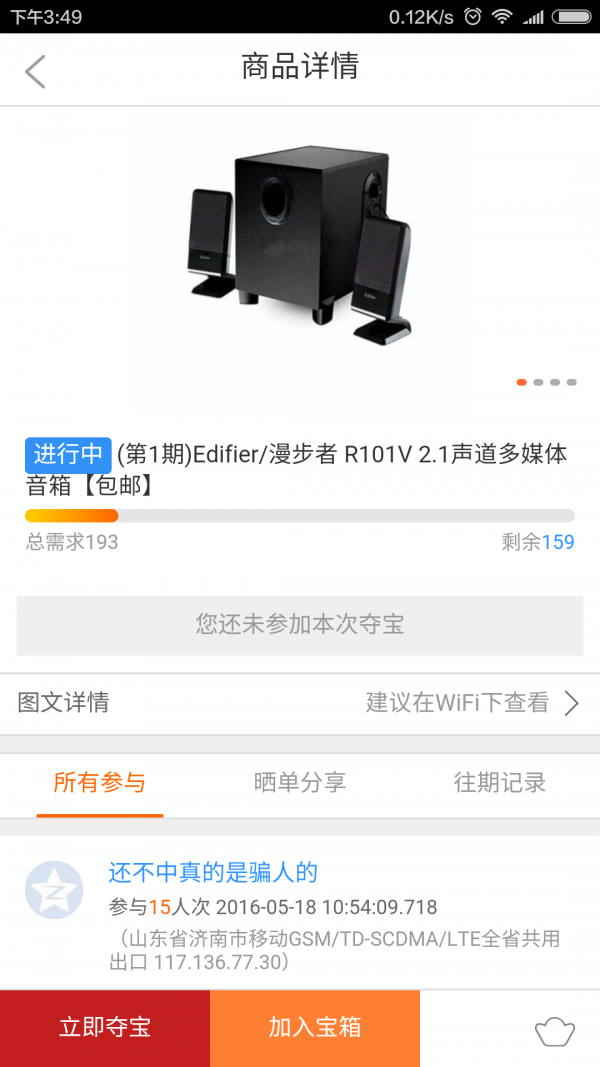 贵州进取云麾电子商务有限公司旗下夺宝平台,一元即可夺得心仪产品。注册就送积分、夺宝币。整合家庭、个人喜欢物品,一块筹宝,一元解千筹。