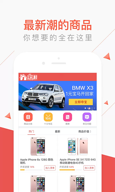 1元村app是一种全新的互动购物体验方式,是时尚 、潮流的风向标,由郴州舜杰网络科技有限公司注入巨资打造的新型购物网。在1元村app只需1元就有可能买到一件商品。