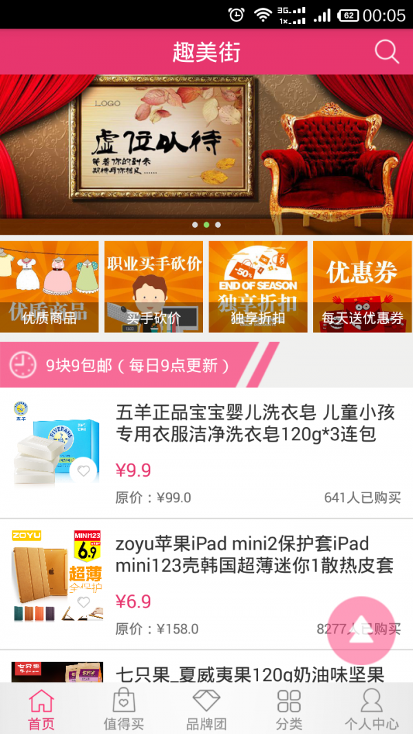趣美街是一款电商购物应用,为用户精选大量天猫淘宝的特价商品,方便用户享受超优惠的购物价格,九块九包邮让用户购物更省心,让用户享受实惠超值的网购体验。