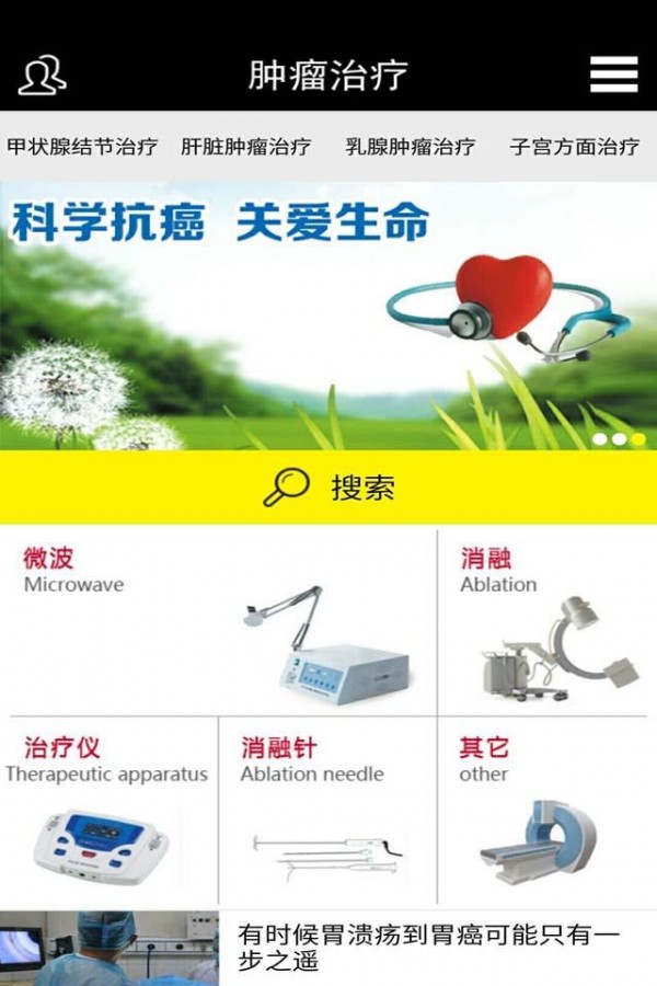 肿瘤治疗app是一款针对肿瘤产品的电商购物平台,用户可在线购买微波、消融、治疗仪等医疗产品,用时,还能查看各种关于肿瘤治疗的相关资讯。