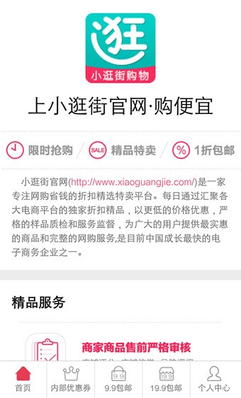 小逛街app是一款网络购物应用,是造想科技打造的移动购物平台。小逛街app集服饰、居家、母婴、美食、鞋包、美妆、数码电器和文体等爆款商品,天天特价9块9包邮!低价折扣,包邮妥妥滴,是手机必备的购物神器噢。