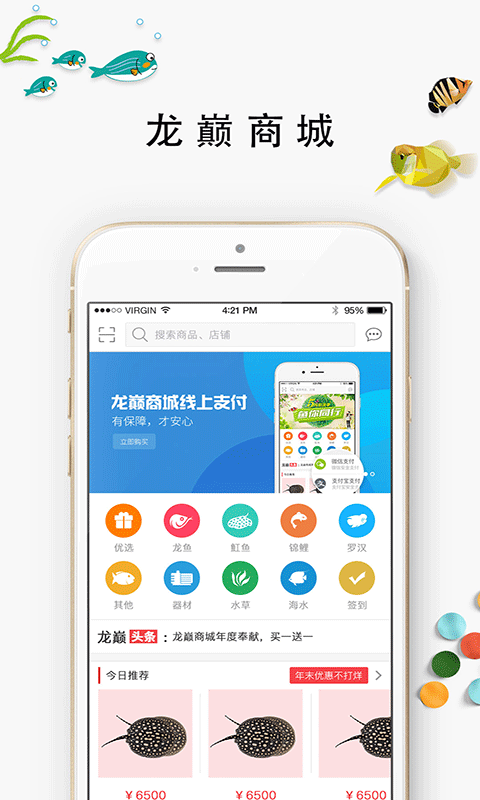 龙巅商城APP是手机上的龙巅,具有商品搜索/浏览、评论查阅、商品购买、在线支付、实时通讯、订单查阅等功能,为您打造简单、快乐的生活体验,从此购鱼无忧。