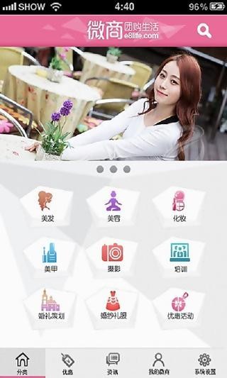 微商团购生活是从事美容、美发、婚纱摄影、美甲、化妆等日常生活团购服务的移动终端软件,她非常合适年轻人使用,让你在玩手机时候就能了解更多合适你的时尚资讯并获取更多的折扣服务。