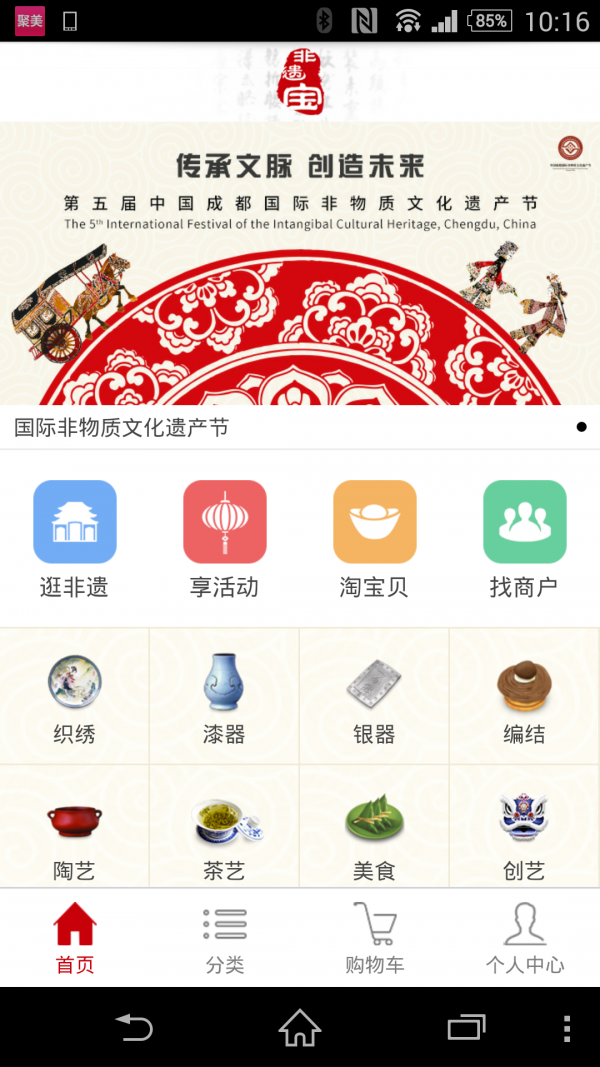非遗宝app是一款非物质文件遗产商城应用,用户可以在这里获取成都国际非物质文化遗产节的活动信息,同时选购喜欢的非物质文化遗产纪念品,体验便捷的购物服务