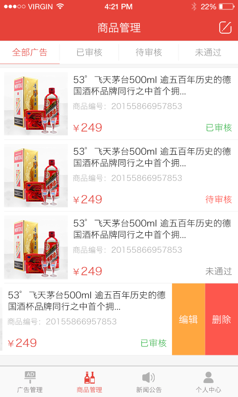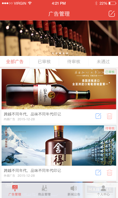 1.广告管理:厂家及品牌商发布的广告投放预览及状态。