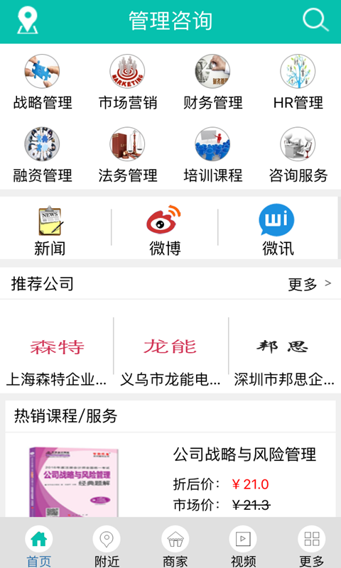 管理咨询是专业提供管理相关产品的移动应用,包含战略管理、市场营销、财务管理、HR管理、融资管理、法务管理、培训课程、咨询服务等多类别的产品,价格优惠,用户可下载使用购买。