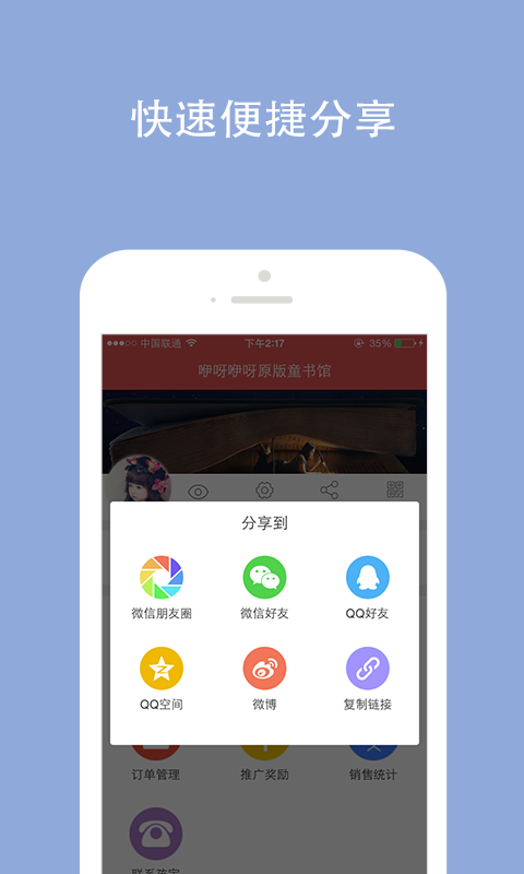 孩宝童书馆app为我们的阅读推广人提供便捷的移动端童书馆管理工作,以及社交分享功能。推广人在手机上即可配置自己的童书馆,管理和查询自己图书销售,推广自己个性化学习书单。