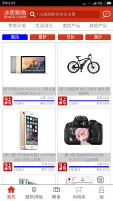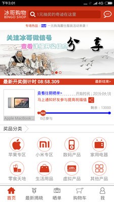 冰哥购物app手机客户端是一款类似于夺宝的购物软件,平台上把商品分成若干个等份,一元出售,最后抽出一名幸运观众获得,你是不是那个幸运的人呢?赶快下载体验吧。