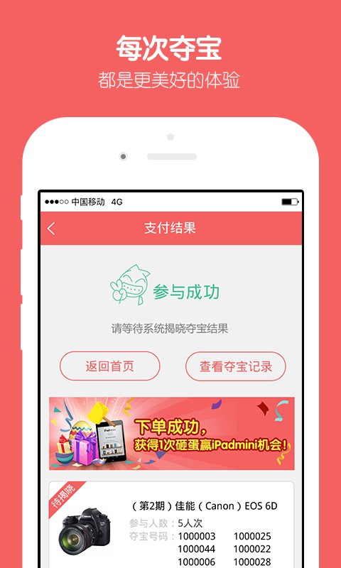 【紧张刺激奖励过程】 参加一元夺宝,您能体会到不一样的紧张刺激,更有机会享受获奖的惊喜!