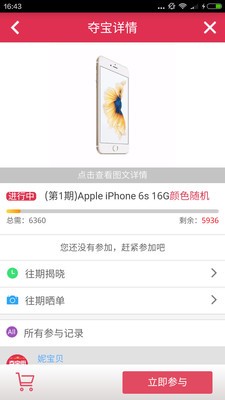 夺宝街app怎么玩?让我来为您解析,比如:一台电脑总共需要6000夺宝币,最低可投入1夺宝币参加夺宝活动,每投入1夺宝币即可获得一个随机号码,当该所有用户投入该产品满6000夺宝币后,系统通过具体的计算公式计算出最终中奖号码,拥有该幸运号码的用户即中奖,当投入的夺宝币越多,获奖几率也就更大。