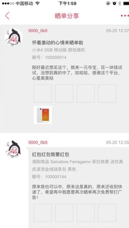 4、和朋友分享喜悦:查看其它用户的晒单分享,见证他们在一元网购收获的喜悦。