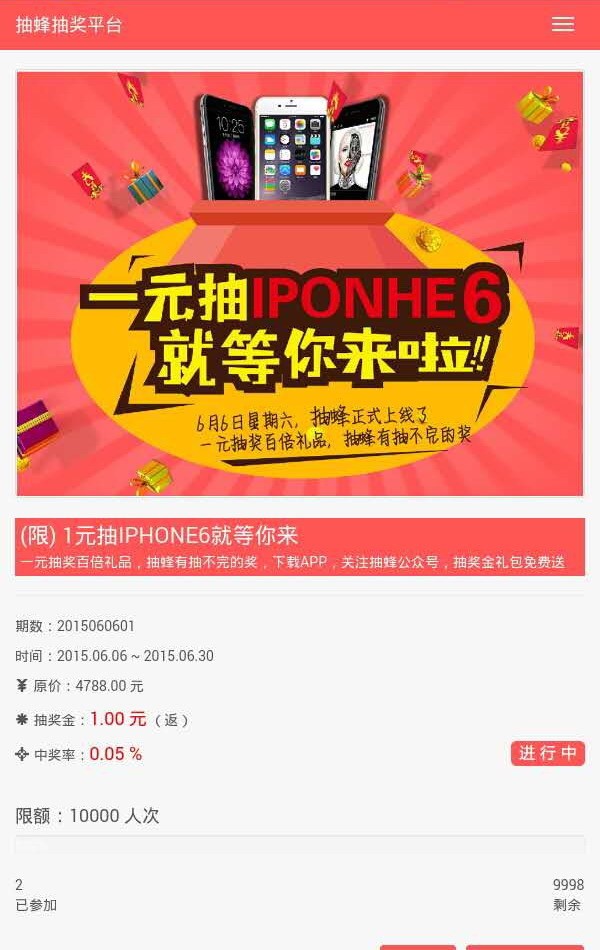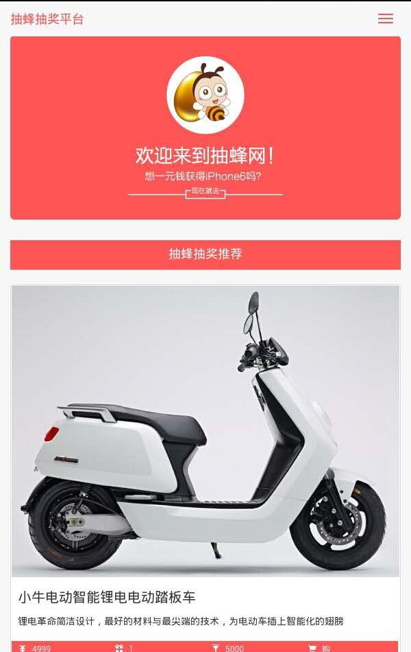 抽蜂有抽不完的奖。一元抽奖,百倍奖品。抽蜂是专注于新奇特产品的抽奖体验网。由商家提供特定的产品给抽蜂会员体验,由于产品有限,抽蜂会员均通过参与抽奖的方式来赢得体验机会。