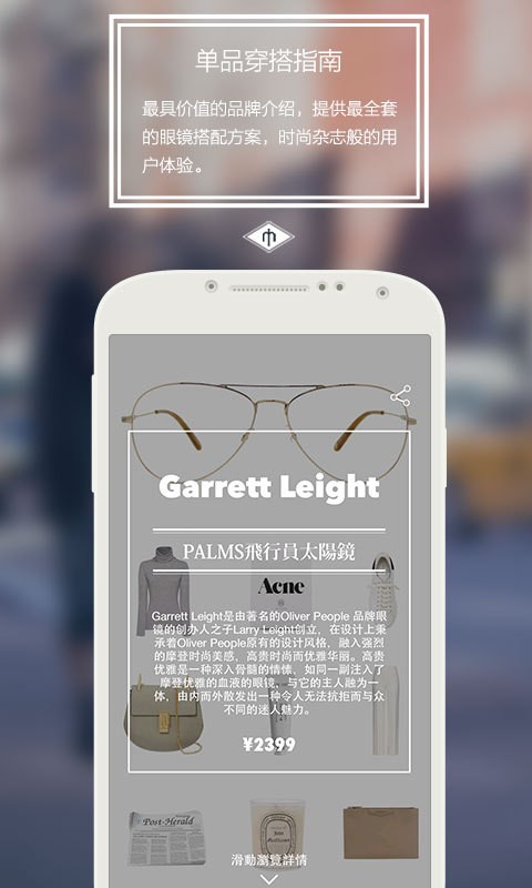 3、根据每款眼镜背后的文化、风格和佩戴场合,每日推送时尚资讯与眼镜搭配指南。