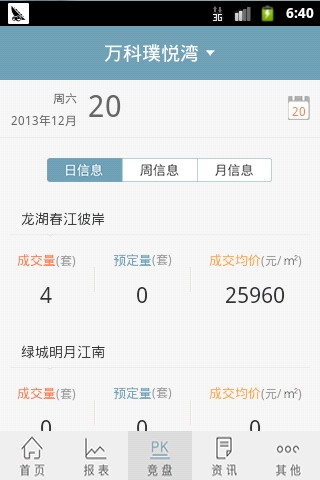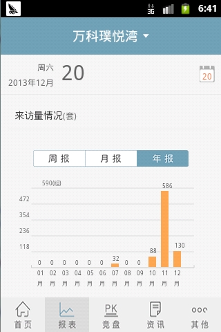 1.通讯录。可查看拨打联系人电话。 2.报表。 饼状图和柱状图显示相应的楼盘数据信息。 3.销售排行。收录显示销售员工销售楼盘排行。 4.首页显示各种销售信息。 5.咨询。可查看楼盘最新咨询信息。