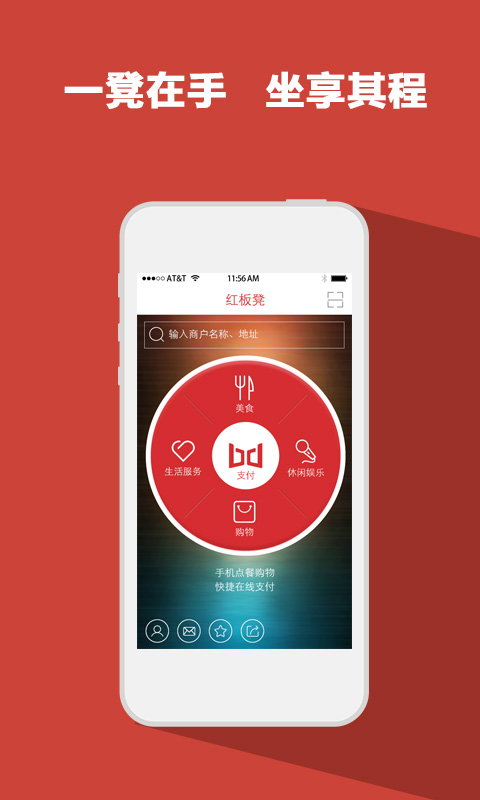 1、餐厅等服务员点菜结账的时代都过时了,用手机自助点餐,轻松方便; 2、不带钱包都可以满城消费,红板凳帮您实现。