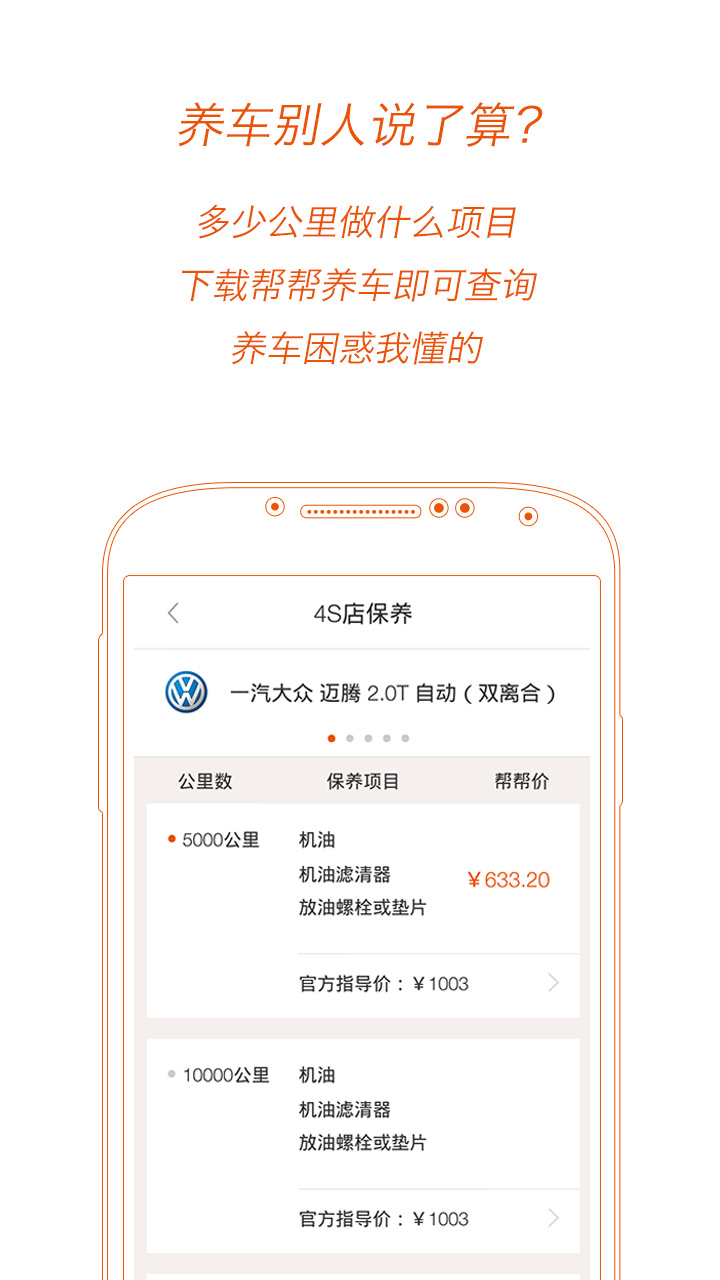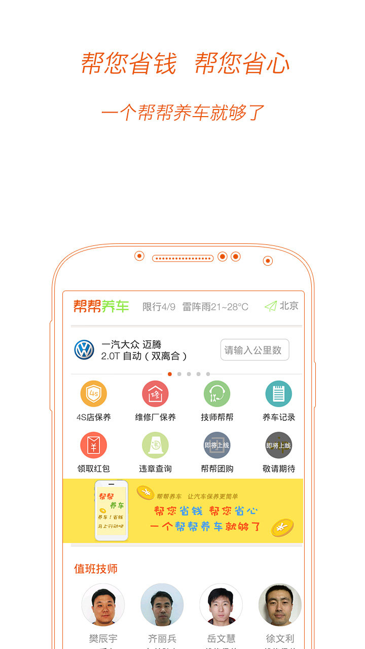 帮帮养车是北京车联时空科技有限公司旗下的一家提供汽车保养、维修等优惠服务的互联网+平台。把全城4s店保养项目、价格透明化,通过在线预约享受保养优惠价格,帮你把钱省下来。