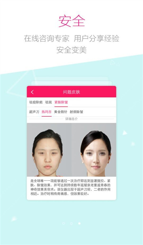 ※提供美妆、日常护肤、皮肤激光美容、微整、美容手术等多种变美方式,任你自由选择最适合的那一种! ※在线咨询专家、预约美容项目,与其他用户沟通交流变美经验,你的变美之路并不孤单。
