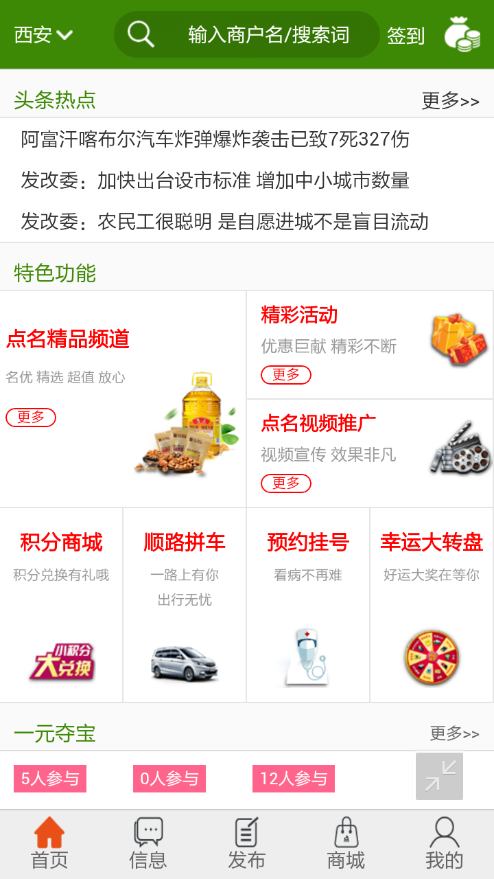 点名网APP是一款服务城乡居民O2O本地商城服务网站,商家可以发布商品优惠信息,休闲食品、酒水饮料、粮油米面、日用百货等生活用品下单后30分钟送到家,乡镇24小时送到村,用户通过手机一键搜索即可获取所需要的任何服务。