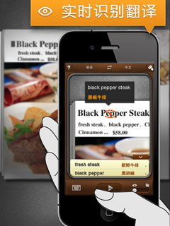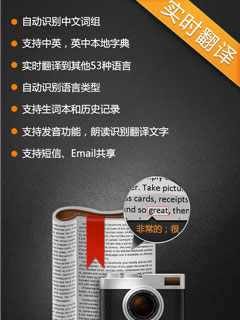 《拍译全能王 CamDictionary》是一款从iOS平台上移植过来的超牛的即拍即译的翻译软件。机相机拍摄生词,翻译解释立等可得。为什么选择拍译全能王CamDictionary?如果您碰到完全陌生的语言,无法手动输入查询,再强悍的电子词典都只是摆设!但是使用拍译全能王,翻译难题迎刃而解。您只需拿起手机相机拍摄生词,拍译全能王自动识别语言种类,并进行实时翻译。 拥有拍译全能王CamDictionary,无需知晓语言种类,只需手机轻松拍摄,轻松读懂陌生语言。