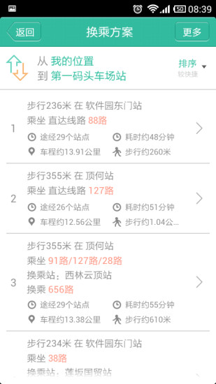 2.多样换乘方案:针对不同用户的需求,系统提供多种换乘路线,用户可按照自身情况选择“直达”、“少换乘”或是“少步行”;
