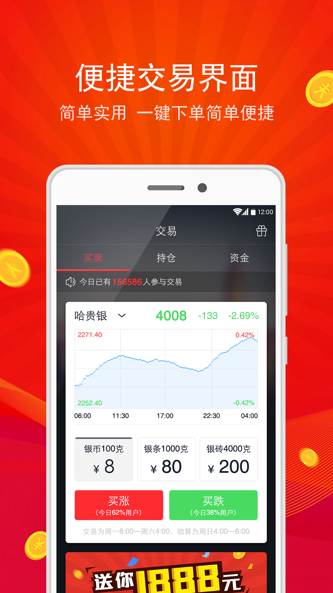 今日操盘app是一个互联网贵金属交易平台,今日操盘app集交易、行情、资讯、策略为一体,今日操盘app为用户提供最低8元门槛,40倍杠杆(8元当320元使用)投资白银、原油等现货品种,让您轻点屏幕即可开启财富之旅。