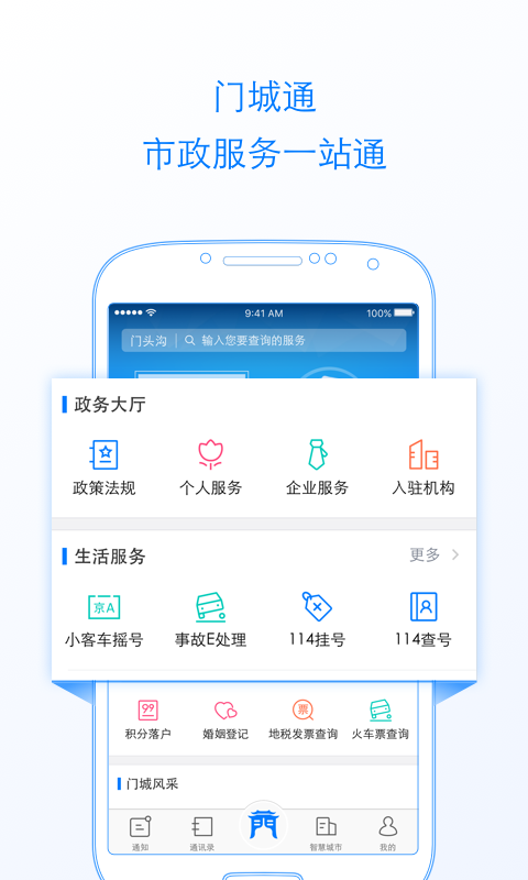 门城通是一款集政府办事、公共服务、社会服务、社交娱乐、当地生活资讯为一体的本地化客户端,向门头沟用户提供包括证照办理、交通、生活、医疗、旅游等一应俱全的门头沟政务及生活服务及相关信息。