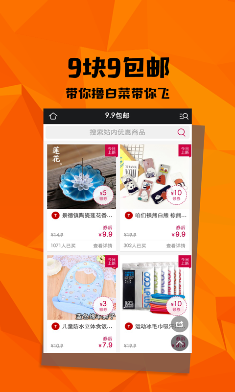 2,九块九包邮专区,用券后淘宝,天猫商品9块9包邮,每天几百款,超级值